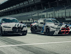 【宝马M4最新官方谍照发布,将在9月23日首发】宝马发布全新宝马M4官方谍照。新车采用了宝马家族最新语言,充分延续全新4系设计。作为性能版多处细节调整,全新M3和M4将在9月23日同时发布。 宝马M4采用宝马最新“超大号双肾”,格栅造型进行了调整,采用更霸气的格栅。配备动感气息更明显包围,换装尺寸更大网状进气口,两侧通风孔面积随之加大。车尾加入造型更霸气扰流板,后扩散器,采用双边四出排气布局。 内饰部分,全新宝马M4和M3延续普通版布局,保留了大尺寸中控屏、全液晶仪表盘等配置,配备固定效果更好的赛车专属一体式座椅。 动力部分,全新宝马M4和M3都搭载宝马最新3.0T双涡轮增压发动机,普通版最大功率480Ps,雷霆版最大功率提升到510Ps,峰值扭矩都是650Nm,匹配6速手动和8AT变速箱,乐之君非常期待有机会感受手动挡变速箱的M3!