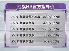 【红旗旗舰轿车H9上市 售价30.98-53.98万元】8月23日,红旗汽车H系列旗舰轿车H9正式上市,新车提供5款车型,向BBA豪车领域发起挑战。外观部分,红旗H9采用了全新的家族式语言,车头极具识别度的红旗LOGO,直瀑式多幅式格栅造型,搭配横平竖直线条呈现出极为豪华质感,两侧大灯搭配L型雾灯提升识别度。 侧面有着流畅车顶和C柱线条。车尾采用两侧纵向排布尾灯相连,与后备厢盖上沿的弧线共同勾勒出了车尾的层次感。 内饰部分,红旗H9着重营造豪华感,采用大量木纹、皮革和镀铬材质装饰。采用了全液晶仪表、大尺寸中控液晶屏提升科技感。新车提供5座和4座版可选,提供黑色和棕色两种配色。 动力部分,红旗H9提供2.0升4缸涡轮增压发动机与48伏电动机组成的轻混系统和3.0升V6机械增压两款动力。2.0T发动机最大功率252马力,峰值扭矩380牛·米;3.0升V6机械增压发动机最大功率272马力,峰值扭矩400牛·米,两款发动机均匹配的是7速双离合变速箱,同时新车将仅提供后驱版本。不过从之前获得的申报图信息中了解到,红旗H9还将搭载一款2.5升V6发动机,目前暂不确定是涡轮增压还是机械增压,其最大功率为276马力。