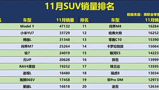 11月SUV销量榜前20名清晰反映出市场向新能源与智能化快速转型的趋势。 特斯拉Model Y以超4.7万辆的绝对优势稳居榜首,展现出强大的品牌与产品号召力。榜单最显著的特征是新能源车型占据主导,不仅包揽前两名,更在前十中占据六席。其中,新势力表现尤为抢眼:小米SU7作为新入局者快速冲至第二,问界M7与M8双双上榜,零跑C10也进入前15,体现了市场对新势力产品的认可。 中国品牌已形成全面影响力,从吉利(博越L、星越L)到比亚迪(元UP、海狮06EV),从传统车企到新势力,在多个细分市场占据主力。相比之下,传统合资燃油车虽仍有途观L、RAV4荣放等车型上榜,但排名已普遍居中下游,市场空间被持续挤压。 整体来看,榜单呈现出电动化渗透深入、中国品牌引领、智能化车型受追捧三大特点,市场竞争格局正被重塑。