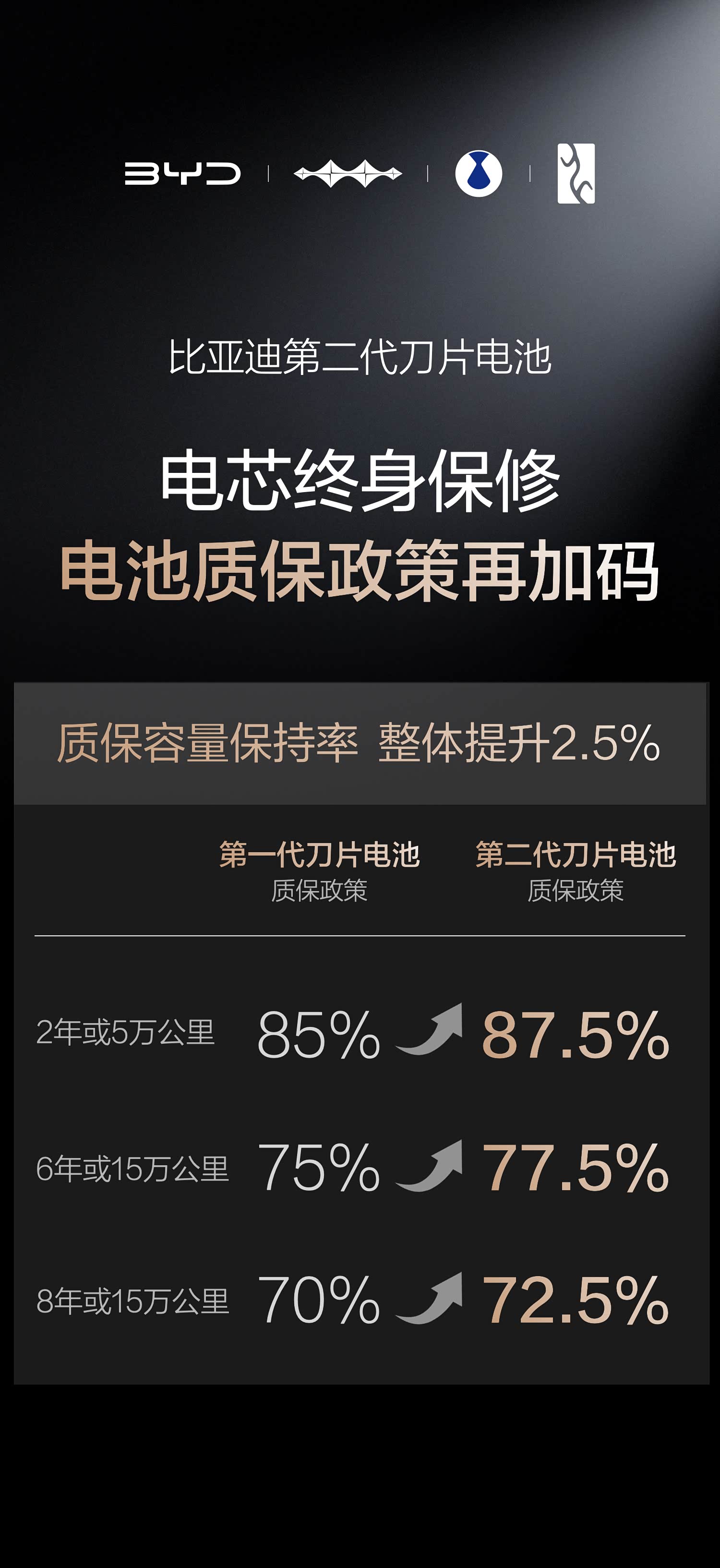 第二代刀片电池寿命安全是否可靠?阿宏用四点简要说明!这次该重新定义电池安全标杆了! 一、创新锂离子通道: 从底层打造锂离子高速通道,大幅提升传输效率,从根源上削弱大功率快充对电池寿命的影响,真正做到充得快又耐用。 二、智能热管理技术: 配合全温域智能热管理系统,实现闪充时尽量少产热,且让热量更快、更均匀地散出去,避免因过热不均导致电池衰减。 三、极限安全验证: 通过远超国标的严苛测试验证长寿命,如500次闪充循环后针刺(模拟15年使用)、同时触发4节电池短路,均无热失控,确保全生命周期安全。 四、超长质保承诺: 电芯实现终身保修,且在6年或15万公里内,电池容量保持率标准提升至77.5%,以政策印证对电池寿命与品质的绝对信心。