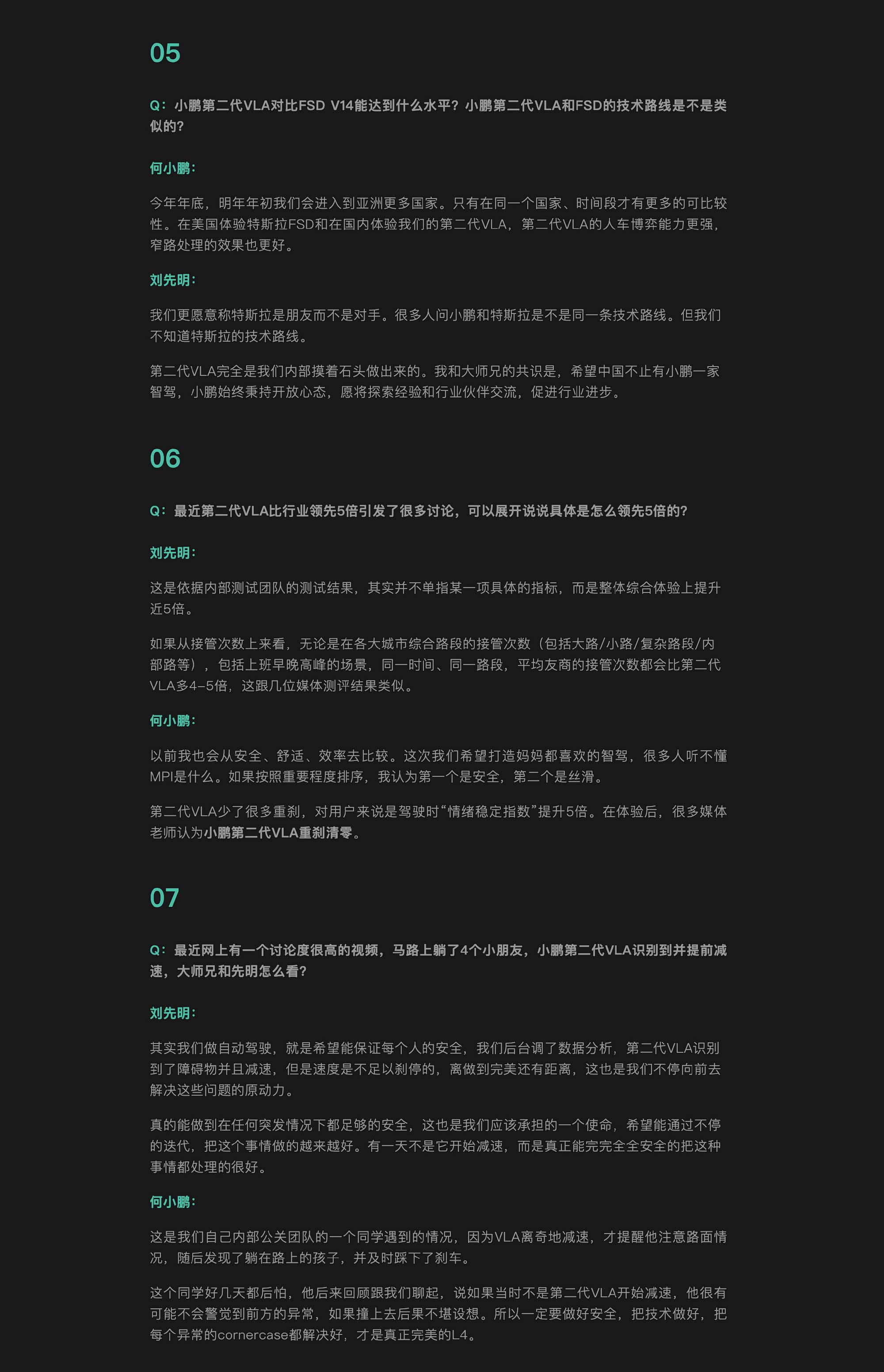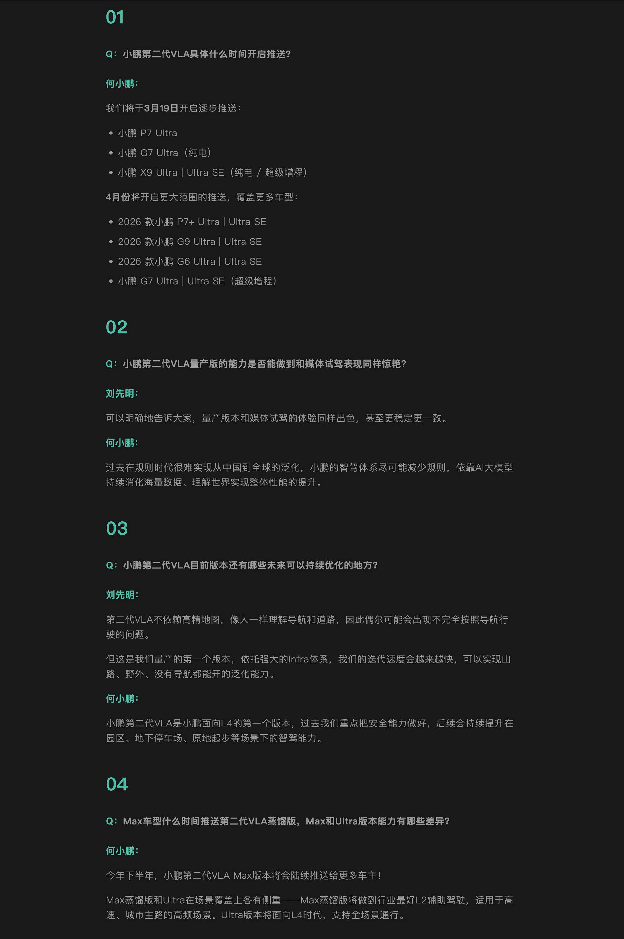给大家简单梳理一下「Ask me Anything」的内容,其实就是小鹏第二代VLA智驾这个月就要正式推送了,小鹏师兄也做了几个问题的回答,我来帮你划个重点: 什么时候能用上? 3月19日开始逐步推送,这个月内P7 Ultra、G7和X9的用户就能陆续收到。4月起,2026款的P7+、G9、G6等车型也会跟上。简单说,不用等太久。 这次智驾强在哪? 一句话,它开起来更像“老司机”了。有媒体刚完成了3000多公里的智驾穿越,从喀什到上海,经历了横风、沙尘暴、大雪,全程几乎不用接管。这种“上线即全国通用”的能力,是因为它摆脱了过去的固定规则,学会像人一样理解路况,遇到施工封路、路上有障碍物等情况,它会自己推理判断,而不是傻眼或退出。官方说综合体验提升了近5倍,最直观的感受是急刹车少了,开起来更稳、更安心,目标是让家里长辈都敢开、爱开。 未来会怎样? 小鹏认为,中美智驾目前同处第一梯队。他们正全力迈向L4级完全自动驾驶,目标是年底能力再提升5到10倍,让智驾真正从“尝鲜”走向“常用”。#大v聊车##何小鹏直播第二代VLA推送#