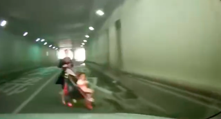 隧道里竟然有人推着婴儿车行走,幸好司机反应快
