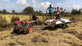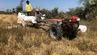 水稻丰收,农民们开着手扶式拖拉机在田间运送粮食