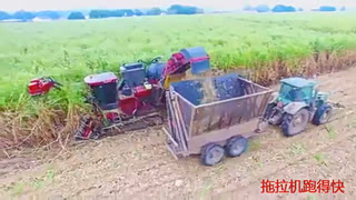 收割机砍甘蔗,为了省去调头时间,农机手机智的倒着拖拉机