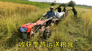 收获的季节,农民正开着手扶式拖拉机在田间运送粮食