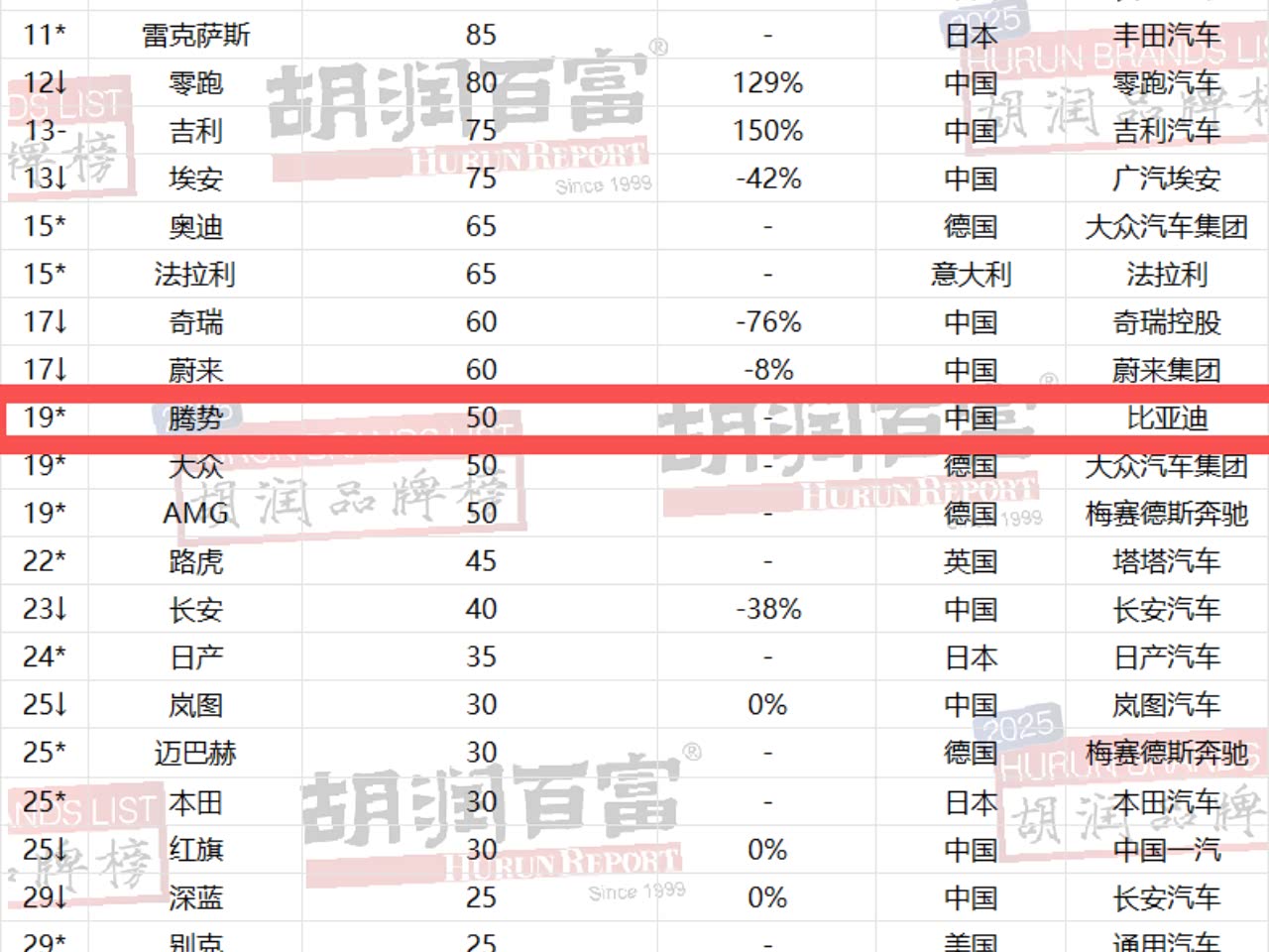 比亚迪连续四年蝉联《胡润汽车品牌榜》中国汽车品牌第一名