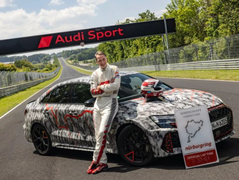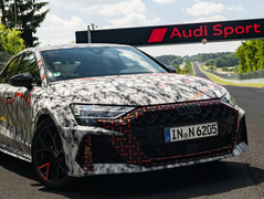 新款奥迪RS3官方谍照公布,并刷新了纽博格林赛道紧凑级车型圈速纪录。新车依旧延续了极具战斗气息的外观设计语言,并对底盘及操控进行升级。据悉,该车将于8月亮相。 根据此次公布的谍照来看,新款奥迪RS3依旧延续了极具战斗气息的外观设计语言。前脸部分,标志性的大尺寸多边形进气格栅内部采用蜂窝网状结构,两侧造型锐利的LED前灯组内部结构也经过重新设计,整体造型更具视觉冲击力与辨识度。 新车侧面造型较为紧凑、流畅,略微上扬的车侧腰线从车头一直贯穿延伸至尾部,搭配大尺寸熏黑轮圈动感十足。 车尾部分,两侧尾灯组同样经过重新设计,并且换装了全新的尾部扩散器组件,大尺寸双边共双出排气系统也依旧得到保留。 动力方面,新款奥迪RS3将搭载升级后的2.5升五缸涡轮增压发动机,最大输出功率可达299千瓦。