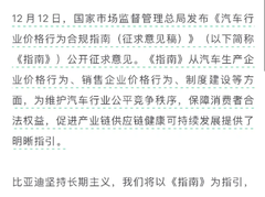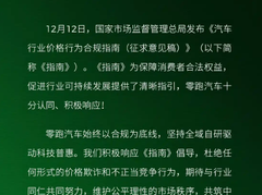 反对价格战! 零跑/小鹏/比亚迪/长安/奇瑞/北汽等多家车企回应支持! 日前,国家市场监督管理总局就《汽车行业价格行为合规指南(征求意见稿)》公开征求意见,为汽车行业提供清晰的价格行为指引,对维护公平竞争的市场秩序、保障消费者合法权益、推动产业健康可持续发展具有重要指导意义。对此,零跑、小鹏、比亚迪、长安、奇瑞、北汽等多家车企回应表示支持。