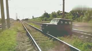 小吉普深陷铁道出不来,火车秒粉碎拦路障碍