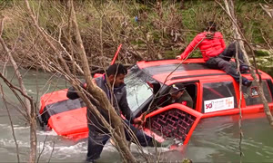 红色吉普鲁莽过河 被湍急河水困住熄火 险些酿成大祸