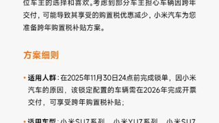 车圈这帮玩套路的真该学学!小米砸 20 多亿兜底全系购置税,简直是撕破行业遮羞布的操作!11 月 30 日前锁单 SU7、YU7 全系,只要是小米生产运输原因拖到 2026 年交付,购置税差额最高补 1.5 万,不搞任何文字游戏。 站行业角度说,这事儿太解气了:一是戳穿了同行的抠门套路,别的品牌要么只补热门车型,要么条款里藏着 “个人原因不补” 的坑,小米直接全系覆盖,真金白银不玩虚的;二是重构了品牌信任的逻辑,现在车企都喊 “用户至上”,但没几个敢像小米这样,订单排到 30 多周还自掏腰包兜底,这比一百句营销话术都管用;三是拉高了竞争门槛,以前大家都靠逼单、玩噱头抢用户,小米这波直接把 “诚意” 变成硬标准,倒逼同行要么跟进要么被骂虚伪。 说到底,行业缺的不是补贴,是不把用户当傻子的真诚,小米这波真的够意思!