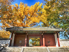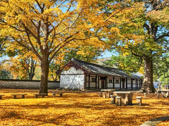 #遇见魅力秋天# 朝鲜靠近三八线的开城的成均馆,可谓是朝鲜之行看到的最美的地方。在朝鲜深秋的阳光下,已经有一千多年的银杏树枝繁叶茂,满树满地都是金灿灿的银杏叶,美得让人流连忘返。在这里遇到了一对结婚的朝鲜新人,能在和煦温暖的阳光,古朴的建筑群和满地的金黄落叶之中结为连理应该是让人高兴的事。走在前面的女子是新娘,而后面的红衣女子则是伴娘——和国内不同,朝鲜的伴娘都是结过婚并生养过的妇女。#汽车之家旅行家#