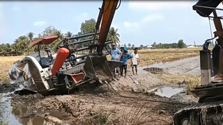 收割机陷泥里无法自拔,挖掘机爬坡过河前来救援,能顺利脱困吗?