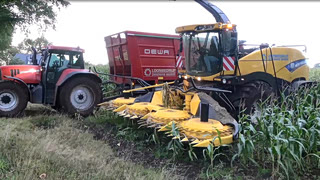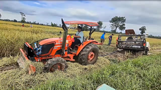 收割机陷泥坑无法动弹,司机快崩溃了,请拖拉机来帮忙终于脱困