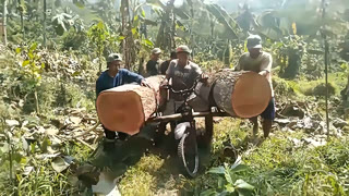 实拍开摩托车拉木头,两根木料1000斤,真费劲