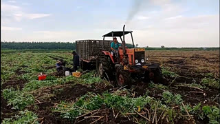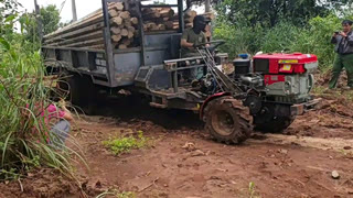 装木薯的拖拉机行驶在肥沃的黑土地上,轮子陷得很深