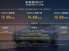 4月9日,吉利银河M7正式开启全球预售,定位“主流精品电混SUV引领者”,预售价区间为13.98万元-15.68万元。作为吉利银河开启两百万新征程的首款新车、M系列首款主流电混SUV,该车首发搭载神盾金砖电池,以多重核心优势刷新主流电混SUV价值标杆。 预售期间,用户可享三重豪礼:500元抵1500元订金券及优先提车权,全系限时免费赠送价值3999元阻尼自适应可变悬架;下订130km探索版、225km探索+版赠8800元16扬Flyme Sound无界之声,下订225km星舰版赠12800元23扬同款音响。 核心配置上,该车依托GEA Evo架构,搭载29.8kWh混动专用电池包,纯电续航至高225km,满油满电综合续航达1730km,馈电油耗低至3.35L/100km,同时支持15分钟快充(30%-80%),电芯循环寿命超4500次,实现电池与整车同寿。 操控方面,其麋鹿测试成绩达81km/h,搭配博世One-Box制动系统,实现35.6米同级最短制动距离。此外,该车还配备Flyme Auto 2智能座舱、千里浩瀚辅助驾驶H3方案及全域安全防护结构,兼顾智能、安全与舒享。 凭借三大技术尖点、十大同级领先产品力及超值预售权益,吉利银河M7有望成为主流电混SUV市场首选,推动品牌在新能源赛道持续向上。