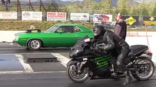 两轮与四轮的对决,900匹的肌肉车VS川崎摩托,到底谁会赢?