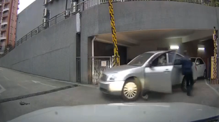 行车记录仪实拍女司机下车未拉手刹溜车,旁边保安只能干着急