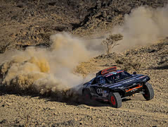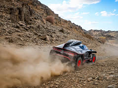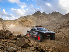【奥迪RS Q E-Tron首战达喀尔】2022年达喀尔拉力赛首日排位赛,三辆奥迪RS Q E-Tron代表奥迪车队出战,成绩最好的是西班牙老将塞恩斯,排位赛位列第二,排在第一的是丰田车队的阿尔·阿提亚。今年代表奥迪车队出战的RS Q E-Tron是增程式混动车,前后轴双电机,外加一台2.0T发动机在行驶时为电池充电。