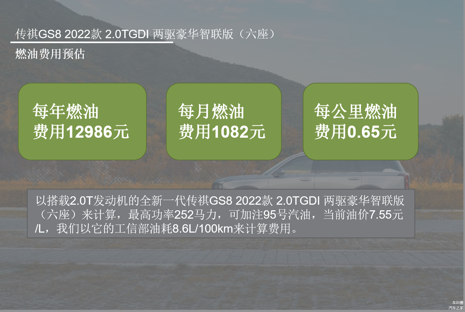综合了保险、保养以及燃油费用,我们得到第二代传祺GS8每年的开销大概在27336元,每个月的平均花费约为2278元,整体的花费并不算太便宜,主要原因归结于燃油的花费相对较高。
