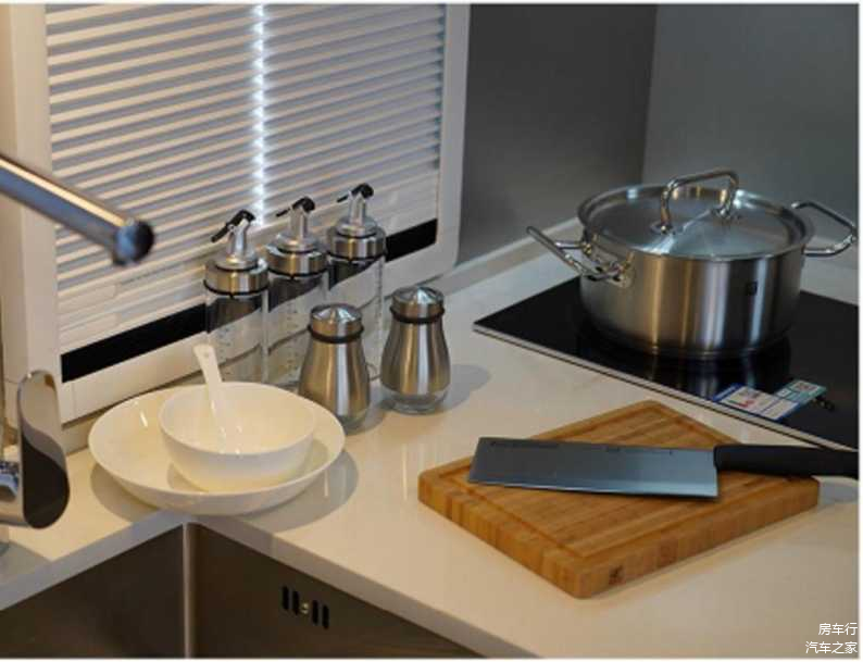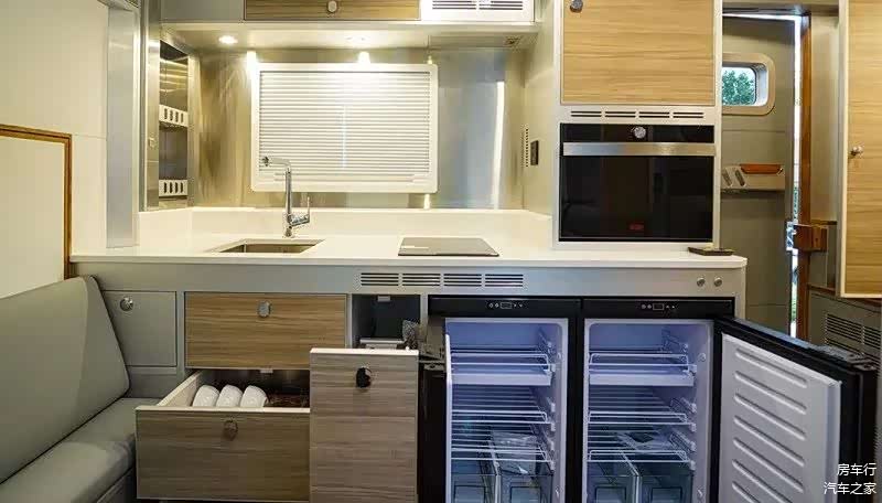 厨房区紧邻会客区,配有独立水龙头、洗菜池、德国2100kw单眼电磁炉、排脱油烟机、德国嵌入式蒸烤一体箱、全套德国厨具等,满足日常烹饪所需;厨柜下方的抽屉带锁,可防止行车时橱柜抽屉打开;冰箱采用诺马迪森152L分体嵌入式冰箱,分为左侧和右侧两部分,方便存放物品。