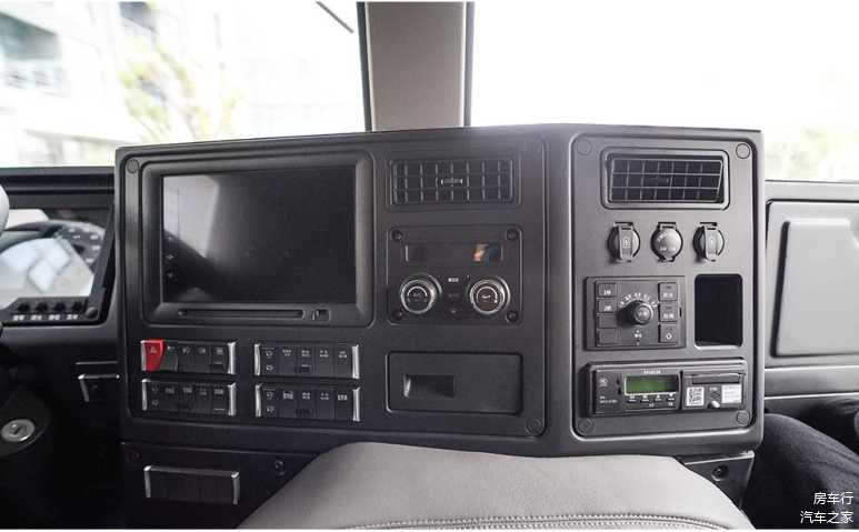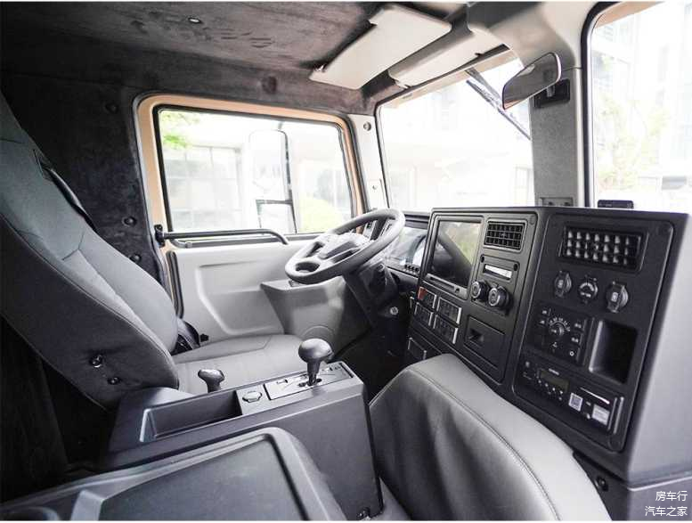 进入驾驶室内部,可以看到空间非常宽敞,内部设有多种功能调节按钮,方便日常使用;驾驶室主副座椅均采用空气悬浮式座椅,乘坐非常舒适,中间位置设有固定式座椅;中央位置的高清显示屏,可以用来观察倒车影像,方便日常驾驶。