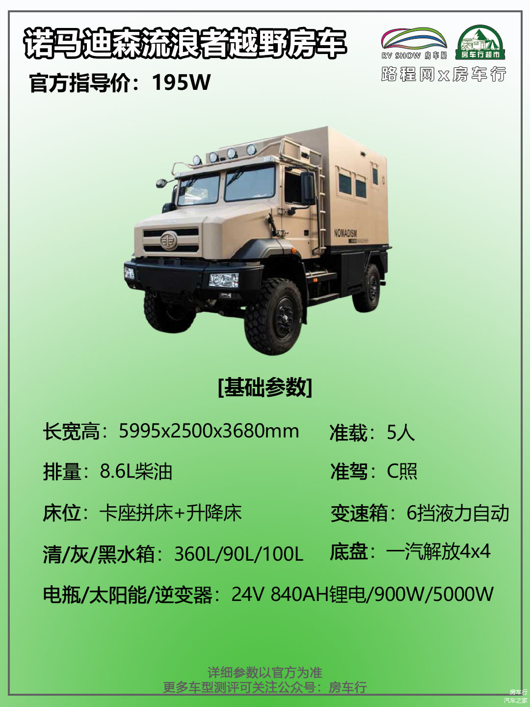 此外,与水电系统搭配使用的还有美国品牌水泵、荷兰清水箱过滤系统、冬季水路智能保温系统、25L电热水器、雅马哈EF2200iS 1.8kw汽油发电机、诺马迪森大功率智能混合供电系统、荷兰品牌电池隔离器等设施。目前,这款房车的官方指导价为195W,大家觉得这款房车怎么样呢?欢迎下方评论区留言!(ps:参数/图片来源于诺马迪森房车官方)声明:文中价格、参数仅供参考因配置、版本不同部分数据或有变动具体请以官方为准图文编辑排版:墨 羽校审:夜如霰·END·