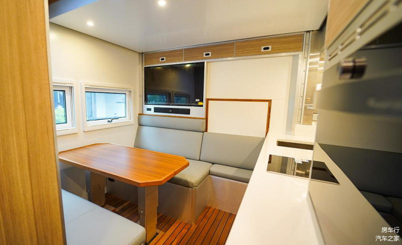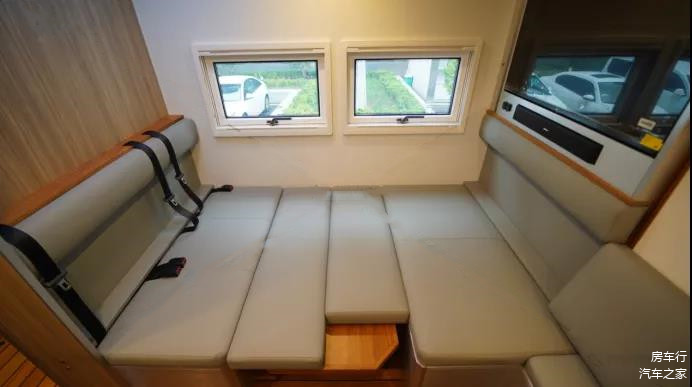 会客区位于驾驶室后方,配有对向沙发卡座(配有真皮沙发垫),中间位置设有可升降餐桌,与卡座搭配可拼成2000x1200mm沙发床;卡座上方设有2000x1200mm隐藏式电动升降床,床面铺设乳胶床垫,为车友提供了一个舒适的休息环境;卡座上方还设有小米电视和美国BOSE音响,可连接车内全网通高速5G车载网络使用,丰富户外旅行娱乐方式。