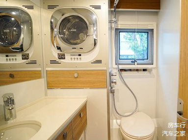 尾部卫浴区采用干湿混合设计,配备了独立水龙头、洗手盆、德国汉斯格雅自动恒温混水器和花洒、法国陶瓷电吸马桶、无线遥控双向换气扇(带雨水感应)、壁柜进口MINI滚筒洗衣机、PTC空气加热系统等,满足日常卫浴、盥洗需求;洗手盆下方设有储物空间,方便收纳洗漱用品。