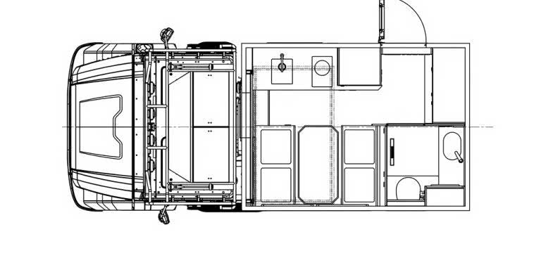 驾驶室后方是生活舱,采用进口配置,配有荷兰进口游艇级天窗、英国进口游艇级遮阳帘和防蚊网等设施,地面铺设顶级船用柚木地板,同时使用植物油抛光(无化工油漆),看起来非常美观;照明系统采用24V LED照明灯饰,搭配进口遥控开关;通风系统标配诺马迪森24V静音空调和无线遥控双向通风换气扇(带雨水感应),此外还配有德国进口4kw柴油暖风锅炉取暖系统,可用于提升严寒天气时车内温度。