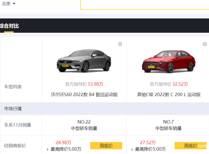 我们就以具体车型为例来详细对比看看吧。奔驰C 200L运动版,指导价格32.52万元,沃尔沃S60 B4智远运动版指导价格33.98万元,两车目前都有较大的优惠,比如在北京,落地价格都在28万元左右。