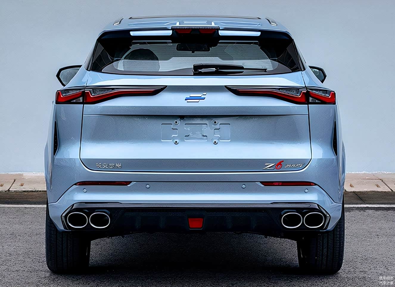 车身侧面,欧尚Z6同样是借鉴了长安UNI-K的设计,能够感受到强烈的运动气息,大溜背的造型营造出了几分跨界轿跑SUV的既视感,全新的轮毂造型要比长安UNI-K更酷炫,进一步强化了整车的律动感,而尾部的设计也是看点十足,全新的LED尾灯采用了类似“W”的设计造型,并进行了熏黑处理,点亮后的效果格外醒目,双边四出的圆筒状尾排非常的个性,颇有“小钢炮”的影子,而“Z6”尾标可以说很抢眼,跟其命名形成了呼应。