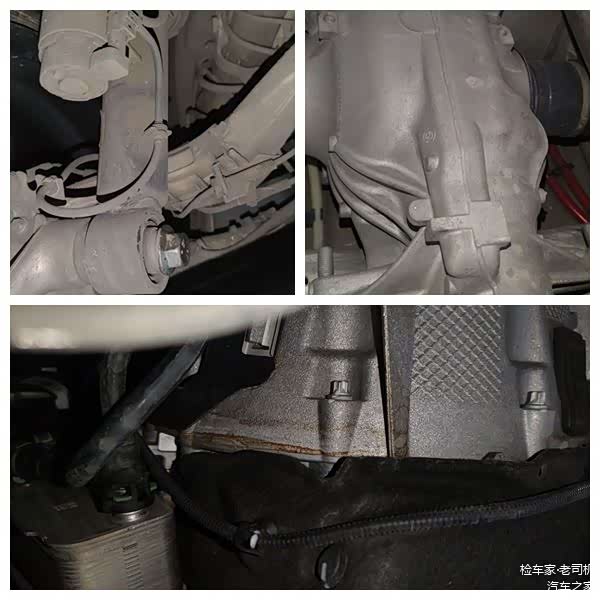 最后一项,检测底盘。底盘大体上都是原车状态,四轮悬挂没有异常,发动机变速箱的机爪也都没有动过,发动机后部有点油迹,这个还得具体检查是不是曲后油封渗油。