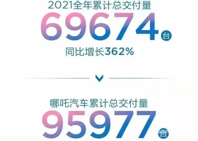 哪吒汽车2021年哪吒汽车累计交付量为69674辆,同比猛涨362%,历史累计交付量达95977辆。具体车型来看,哪吒V历史累计交付突破5万辆。哪吒U Pro交付4847辆,环比增长62%。哪吒汽车从6月份开始就实现稳定增长,除了与市场本身发展情况有关,与360的合作也存在一定关联。
