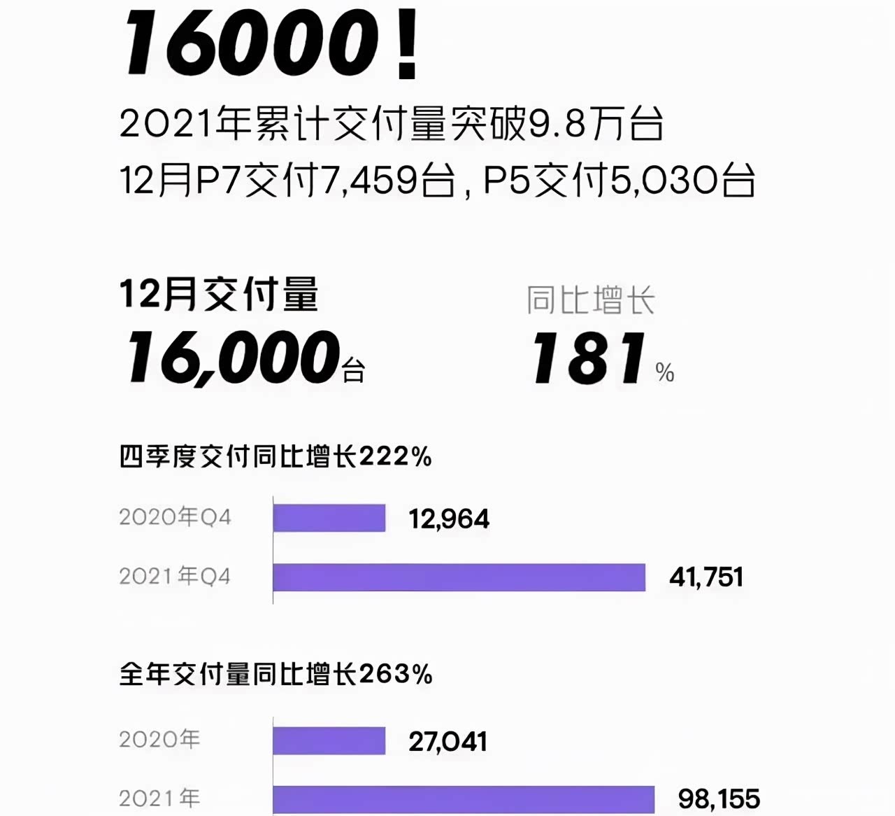 造车新势力们的表现同样不可小觑,从年度交付来看,小鹏领先蔚来蝉联冠军。数据显示,小鹏汽车在2021年累计交付新车98,155辆。小鹏P7作为销量主力,全年累计交付达60569辆,占全年总交付量的62%,全新紧凑型轿车小鹏P5 12月交付量为5030辆。