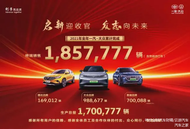 一汽-大众官方正式发布了2021年的终端销量,最终终端销量为1,857,777台(含进口奥迪)。分品牌来看,捷达品牌全年销量为169,012台,大众品牌全年销量为988,677台,奥迪品牌全年销量为700,088台。在过去的2017—2020年,一汽大众的终端累计销量已经连续四年超过200万辆,而2021年的销量,连2016年的190万辆的销量,都未达成。