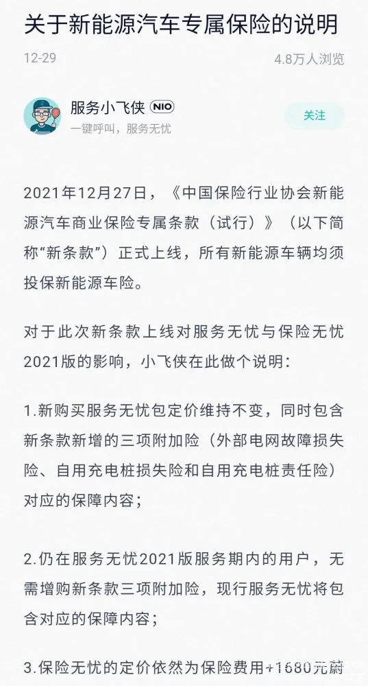 蔚来汽车也在第一时间回应,表示目前不受新能源汽车保险新政的影响,在增加新政策的三项附加险的情况下,车主将继续享受蔚来提供的2021版“服务无忧”和“保险无忧”的套餐价格。