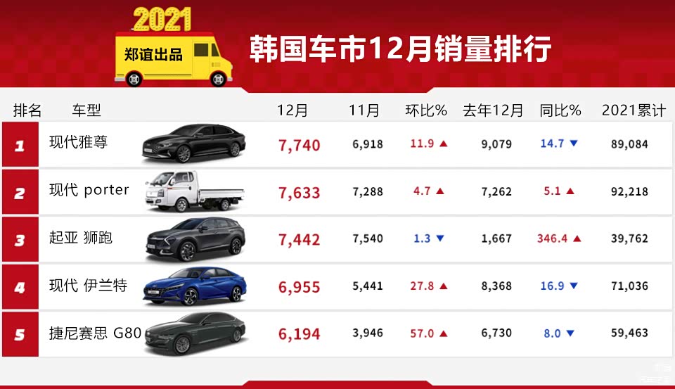 本篇文章给大家带来的是2021年12月韩国车市销量排行。2021年12月,韩国汽车行业销售129392辆,同比下降2.7%。虽然通过年终促销等方式连续三个月实现了10万辆的月销量,但由于半导体短缺,新车供应困难仍在继续。