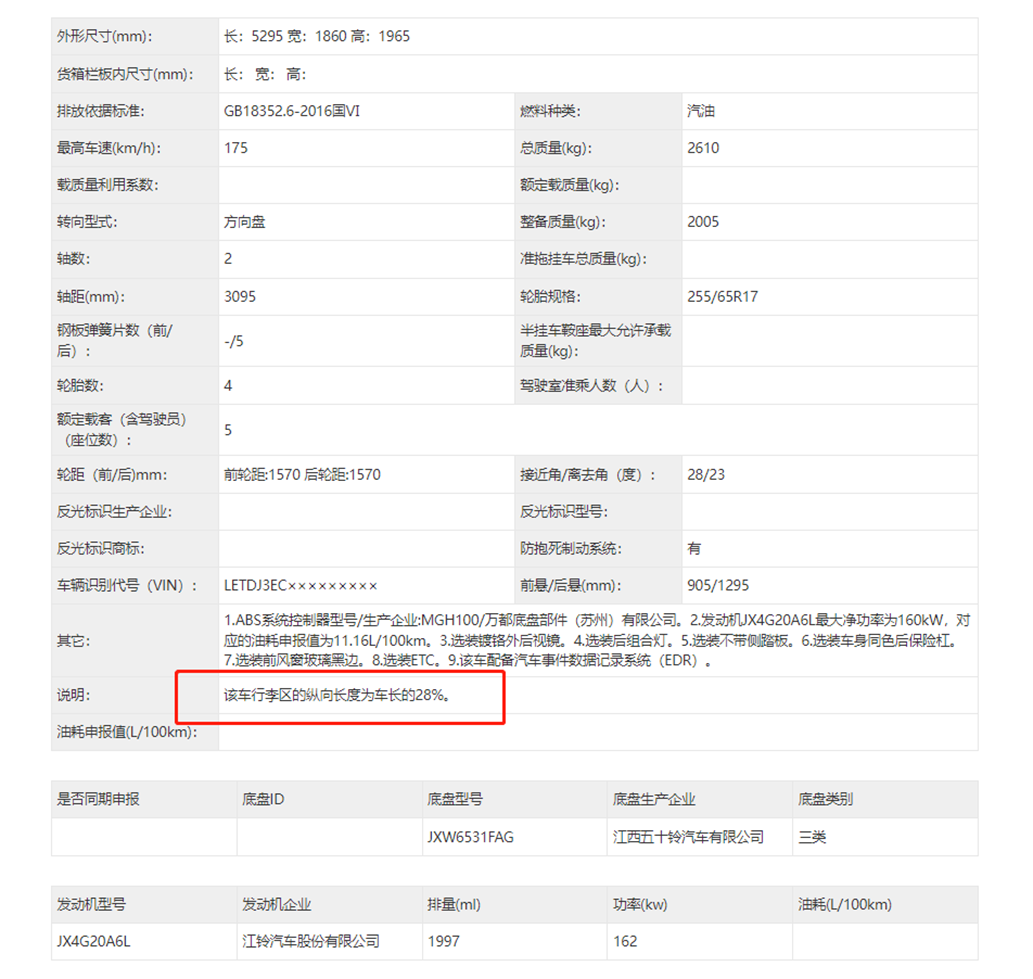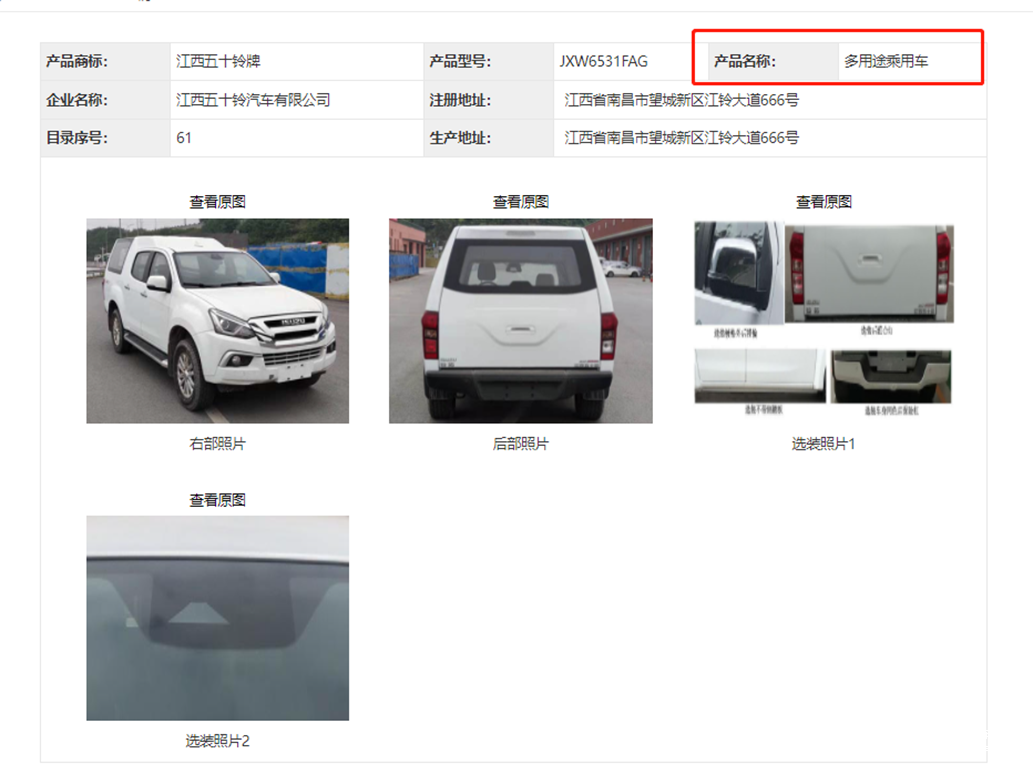 而皮卡货箱加盖的促生了6字头皮卡的诞生,也就是在货箱增加带有车窗的一体式封闭后盖,然后以6字头多功能乘用车的形式进行申报,也就成了和SUV性质一样的6字头皮卡了。在工信部最新的352批新车申报目录中,江西五十铃申报了一款最新的6字头皮卡。