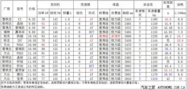 这个价位的欧美车刹车距离大多在38-45米。刹车性最好的是雪佛兰爱唯欧1.6和大众捷达1.6,都在40米以下;较差的是雪铁龙的C2和爱丽舍,都在43米以上。对于最差的C2我想说一句,你的刹车距离比韩国车都要远上1米,你真的是欧洲车吗?还有一个没有测试成绩的207,由于他与C2是同平台的产品,所以刹车距离也是不值得期待的。