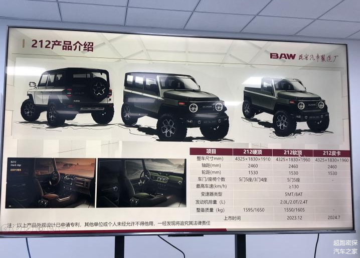 从曝光的PPT上不难发现,新一代的BJ212采用了3种车身模型,例如软顶版、硬顶版以及敞篷版,基本延续了现款产品的设定。
