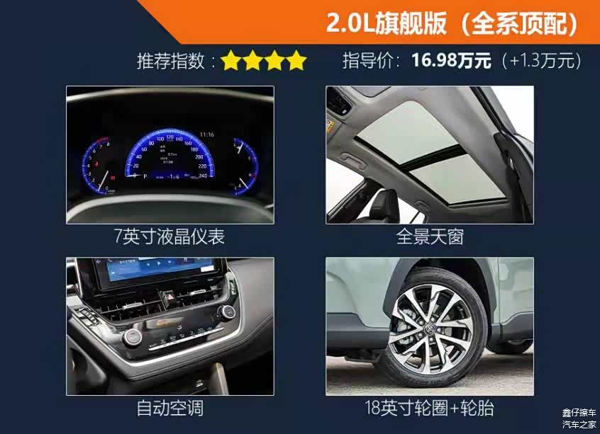 最后点评的是旗舰版,顾名思义也是锐放全系的顶配车型。在次顶配尊享版之上,增加1.3万元,便是旗舰版车型。这1.3万元换来了满满当当的配置:18英寸轮圈、9个安全气囊(比其余车型多2个)、前后驻车雷达、全景天窗、电动后备厢(带记忆、感应功能)、7英寸液晶仪表、单色车内氛围灯、后视镜电动折叠、自动空调等功能。配置方面基本拉满,不过,我们并不特别推荐这款车型,原因是次低配车型(尊享版)配置已经足够,对于丰田或者说卡罗拉 锐放的潜在消费者而言,顶配车型增添的大部分配置属锦上添花。