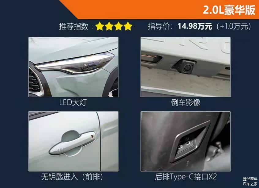 在精英版之上,再加1万元,我们可以购买中配的豪华版,它所需要14.98万元。豪华版相比精英版的增配不算太多,但同样属于非常实用的配置。在精英版基础之上,豪华版加入了倒车影像系统、无钥匙进入功能(前排)、后排Type-C接口以及LED远/近光灯。倒车影像对于新手来说非常有帮助,无钥匙进入以及后排Type-C接口提升了车辆的便捷属性,而LED远/近光灯灯照效果更好,也是提升了安全性。这款车型我们给出4颗星,同样非常值得购买。