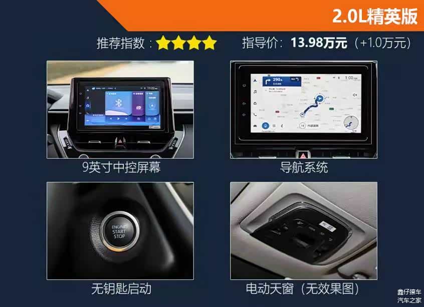 在最低配之上增加1万元,我们能买到次低配的精英版,它的售价为13.98万元。精英版的增配功能都较为实用,例如电动天窗、无钥匙启动、语音识别、车载导航、车联网、OTA升级、后座出风口等功能。我们给出4颗星的推荐,因为增配的功能较为丰富,且物有所值。