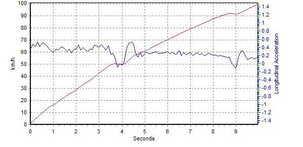 我们还实地测试了RX5 1.5T手动挡的0-100km/h加速,但活动为了挑战最快速度,用了拉转速的起步方式。关掉ESP,把发动机转速吊到2500rpm,然后弹离合起步。短暂响胎之后RX5的初始加速度维持在0.5G左右,由于RX5的齿比设定导致需要三挡破百,两次换挡无可避免,几次尝试之后我们做到最快的破百时间是9.96秒。