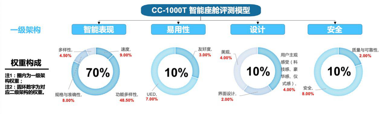 《CC-1000T智能座舱评测体系》共分为基础项和创新项两大类评分,基础项共涉及项目210项,每项5分制,满分为1050分。创新项作为独立评价,根据车型表现,同样每项创新5分制,但不设总分上限。基础项与创新项之和为该车型智能座舱表现的总分值,以此对智能座舱进行完整的评价及描绘。