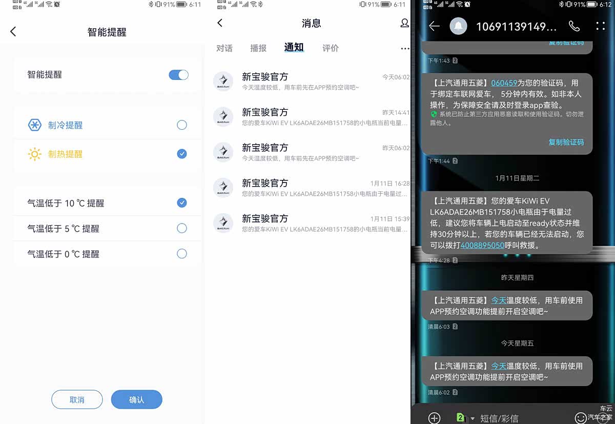 在传统的燃油车时代,远程启动空调可以说是个新鲜的配置,但在电动汽车时代,这样的配置已经变得越来越普及,即便是不到10万的KiWi EV。App远程控空调不但可以远程开启空调,它还集成了空调智能提醒功能,当车内温度低于设定值时,用户将收到app消息提醒与短信提醒,很适合寒冷的地区。但目前来看这个功能还不够全面,首先说智能提醒条件种类偏少,仅有温度设定提醒,如果加入基于常规用车时间区间则实用性更强;其次提醒功能并不能自动开启空调,整体的便利性还有待提高。