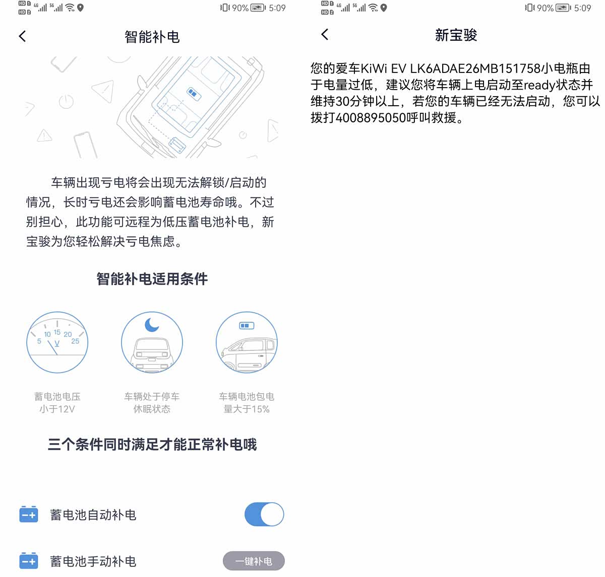 我们知道,电动汽车的动力来源是电池,而车上的其他用电设备,例如空调或音响,其实是由传统的12V“小电瓶”供电的,如果小电瓶没电,电动汽车也无法正常使用。考虑到KiWi EV的定位,本身电池容量仅有31.9kWh,如果长时间没使用车辆,小电瓶馈电的情况还是很容易发生的。针对这个问题,KiWi EV的远程智能补电就能很好的解决。首先我们通过手机App,可以远程开启“蓄电池自动补电”功能,当然也可以选择“手动补电”。智能补电也是有前提条件的,首先是蓄电池电压小于12V,其次车辆电池电量大于15%,最后是车辆必须处于停车休眠状态。
