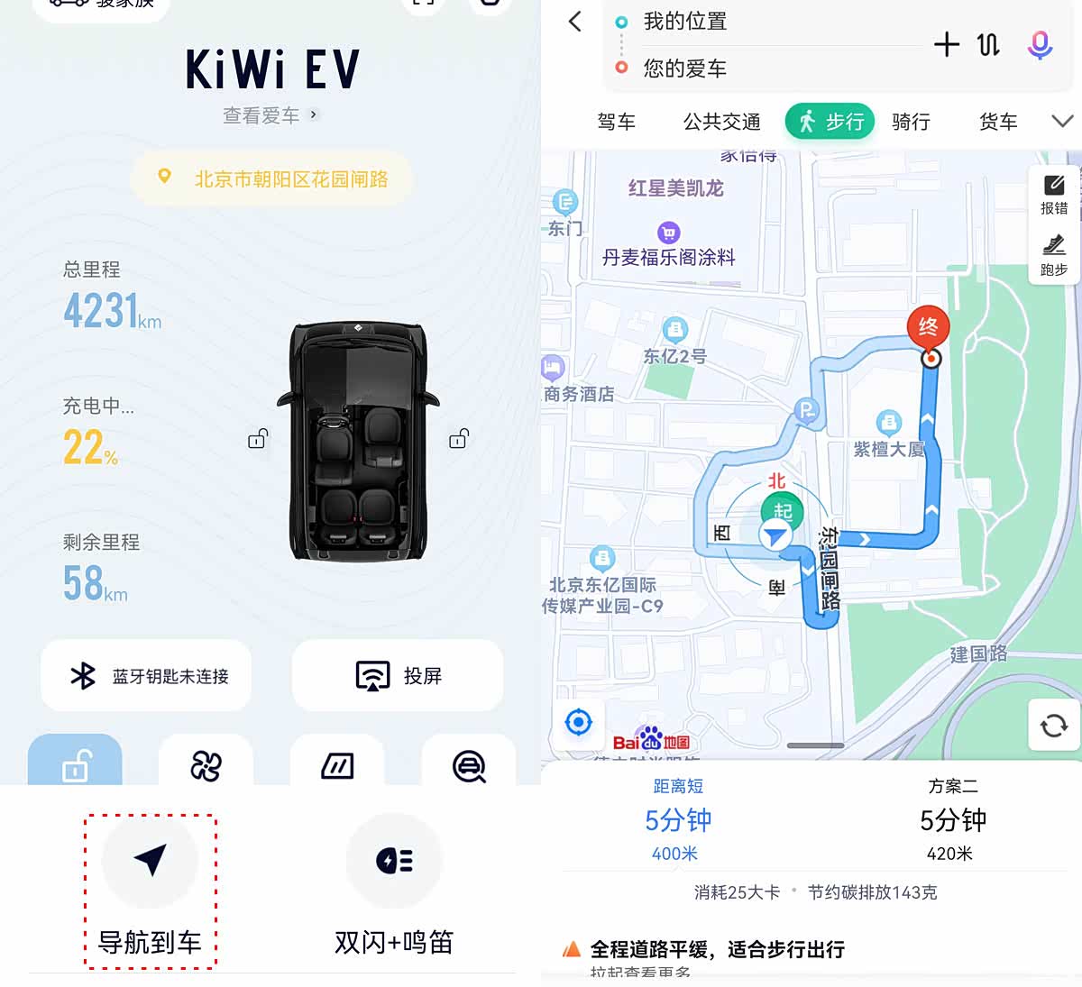 上面说到的App开启车灯是一种寻车机制,但如果是换他人找车或将车停到完全陌生的位置,App导航到车功能就很有必要了。在我们将车辆停好后,车辆的位置会被记录,当用户需要寻车时,位置信息会发送到手机上,进而实现步行导航到车辆附近,可以说是一种更为准确的寻车方法。